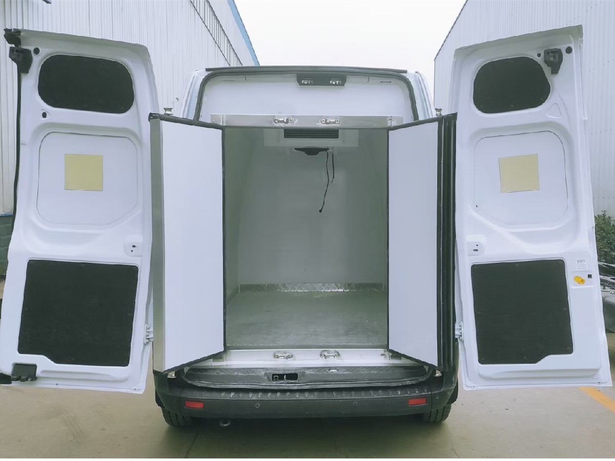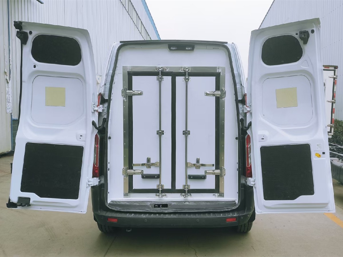 (2)廂板材質:內外壁板選用國內優質玻璃鋼(不吸光、隔熱性好、硬度強、抗氧化);中間保溫層為XPS擠塑聚笨板;廂體厚度8CM。地板采用鋁花紋板,門邊條采用迷宮式橡膠密封條。