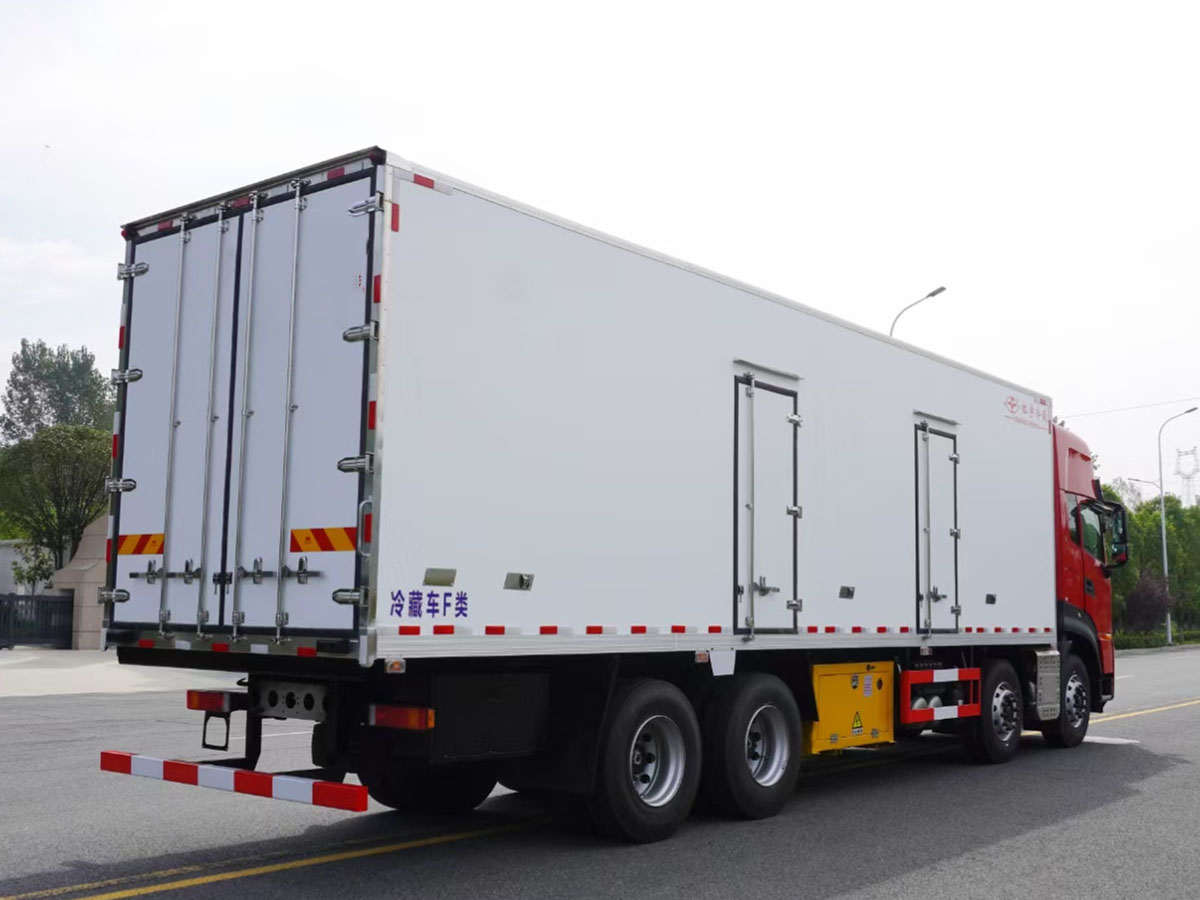(2)廂板材質:內外壁板選用國內優質玻璃鋼(不吸光、隔熱性好、硬度強、抗氧化);中間保溫層為XPS擠塑聚笨板;廂體厚度8CM。地板采用鋁花紋板,門邊條采用迷宮式橡膠密封條。